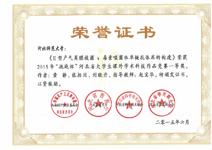 黄 静 张括川 刘晓丹 | 2012级 | 2015年 | 河北省一等奖 | 省教育厅 |