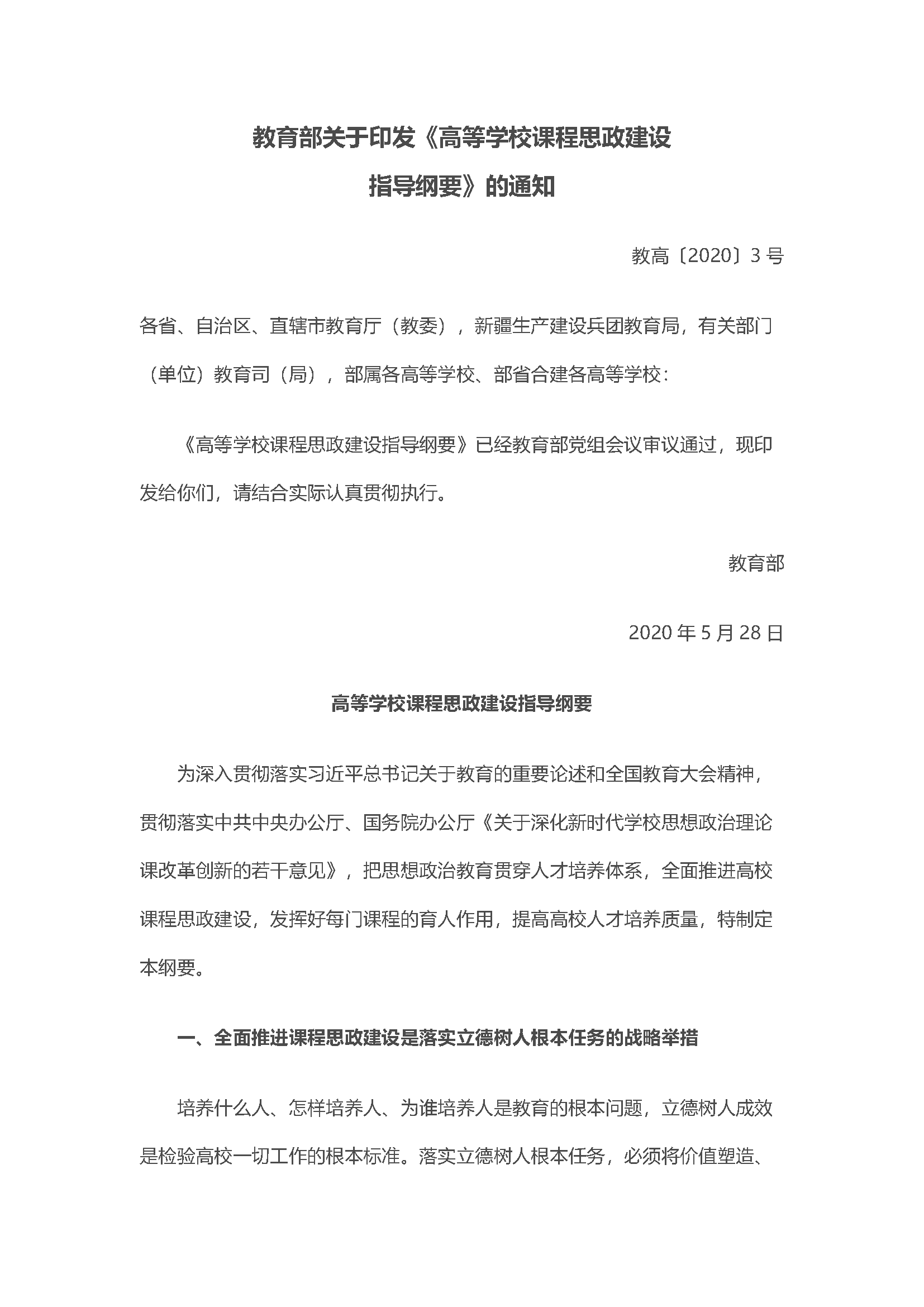 教育部关于印发《高等学校课程思政建设指导纲要》的通知(教高〔2020〕3号